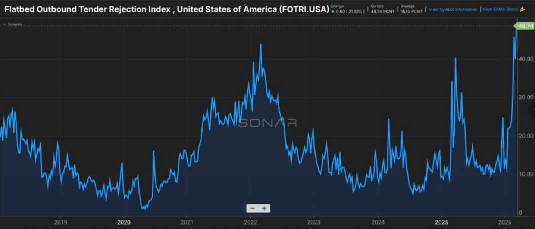 Keep in mind, US flatbed rejection rates (trucking cost) were already surging BEFORE we attacked Iran.